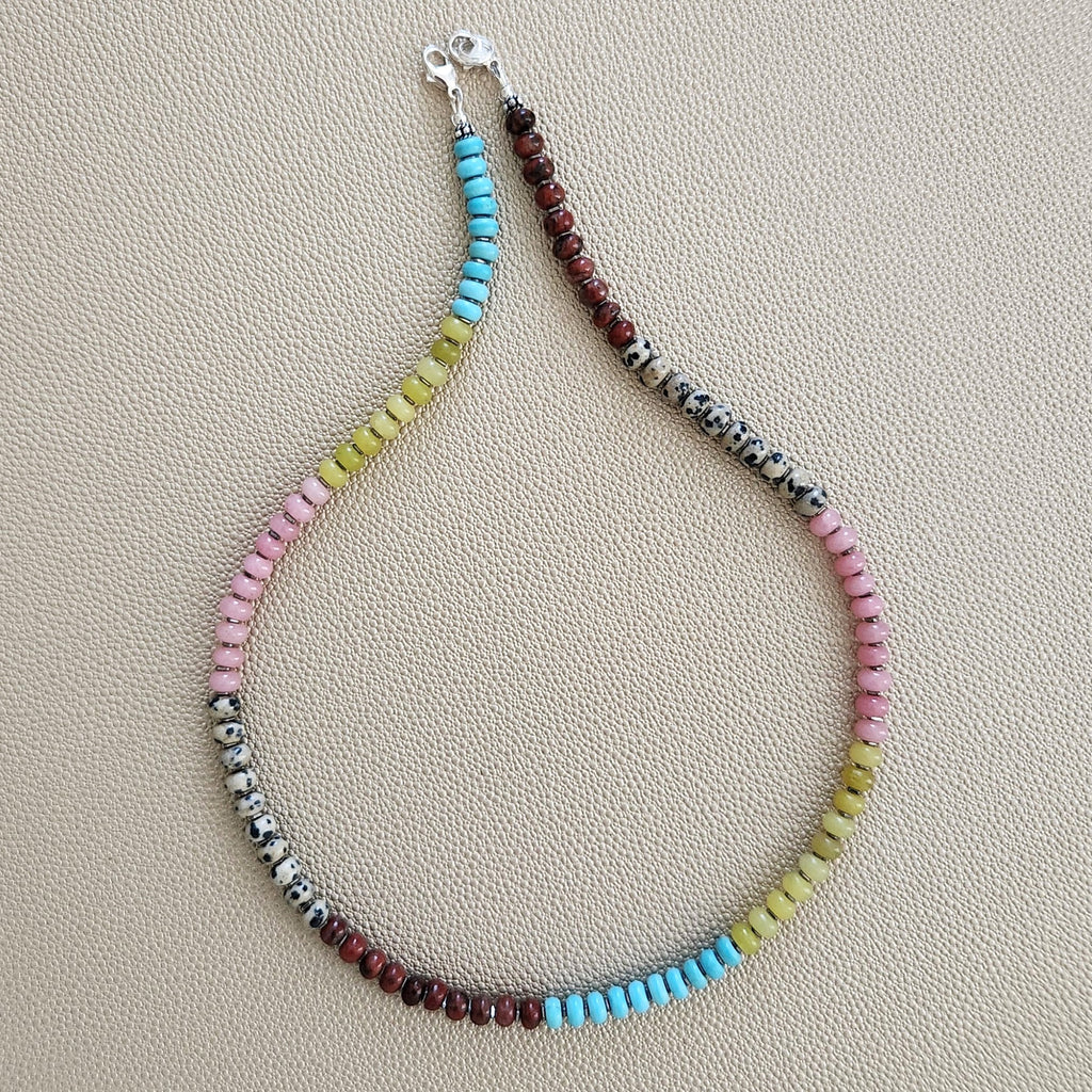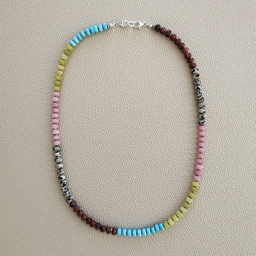 - Multi gemstone necklace with natural red sesame jasper, natural Dalmatian jasper, pink colored jade, lemon colored jade & turquoise