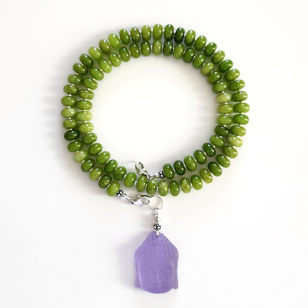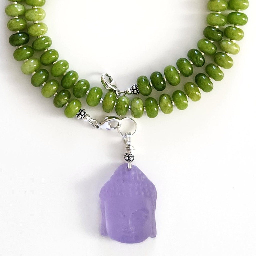 0--GREEN COLOR JADE NECKLACE W/ PURPLE BUDDHA--20"