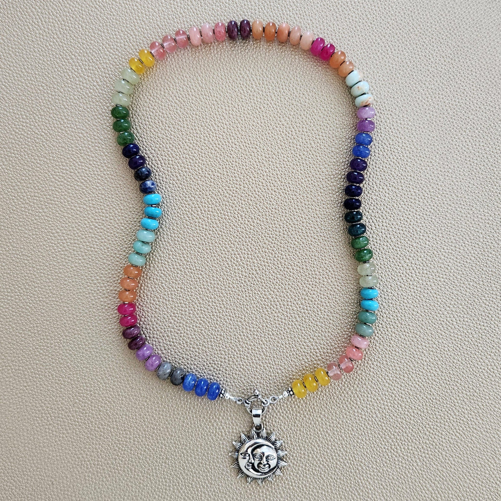 0--HAPPY IN HALIEWA MULTI GEMSTONE NECKLACE W/ SUN & MOON PENDANT--19"