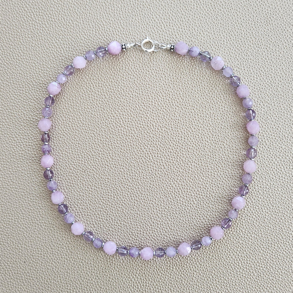 - Multi gemstone necklace with lavender hues--lavender jade (8mm star cut), pink amethyst (6mm faceted), cape amethyst (6mm faceted)