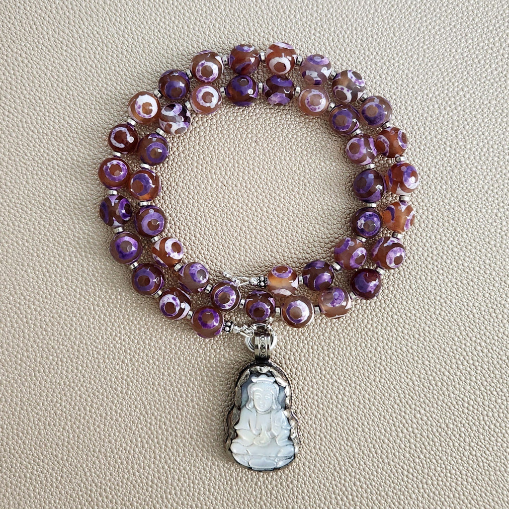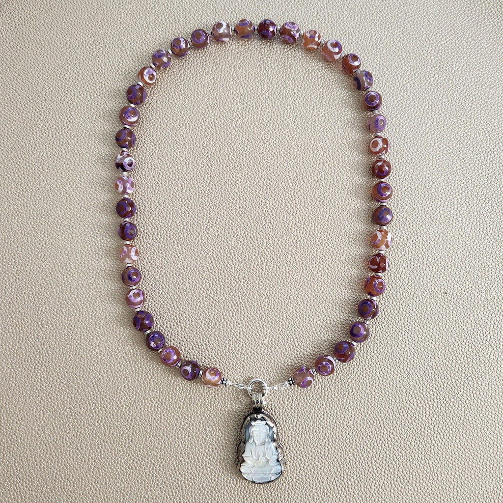 0--PURPLE TIBETAN AGATE NECKLACE W/ MOTHER OF PEARL BUDDHA--20"