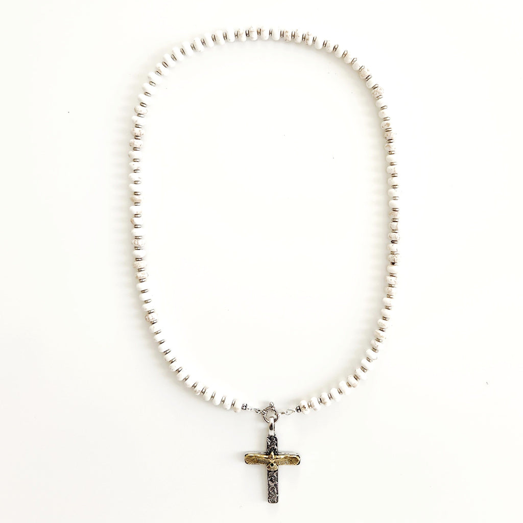 00--WHITE MAGNESITE TURQUOISE NECKLACE W/ EAGLE CROSS--24"