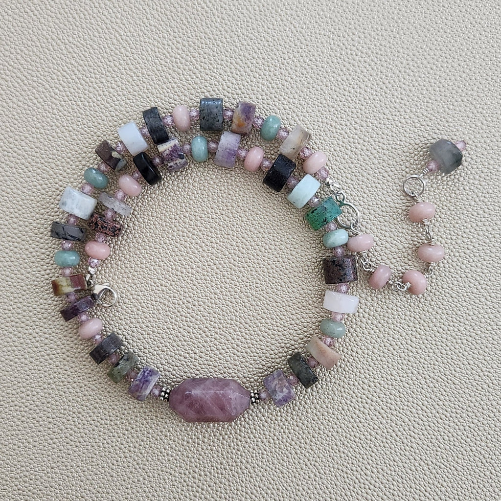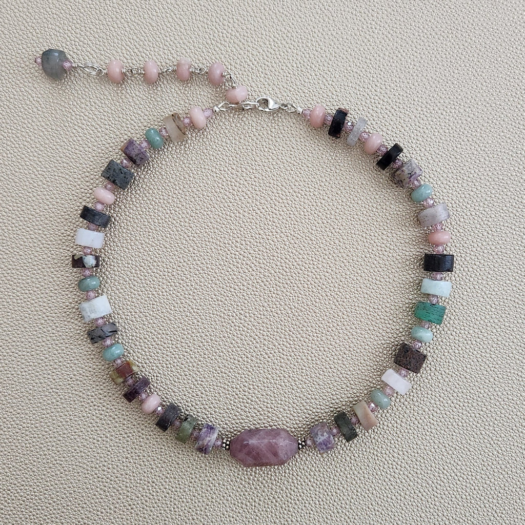 MIXED GEMSTONES & ROSE QUARTZ NECKLACE-16"