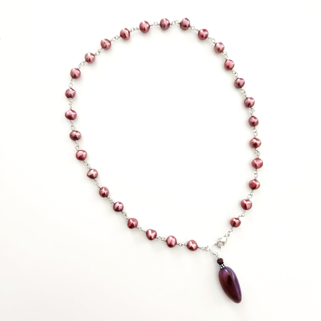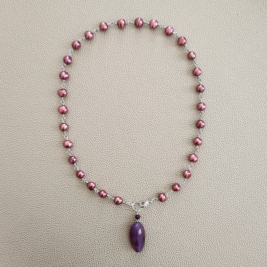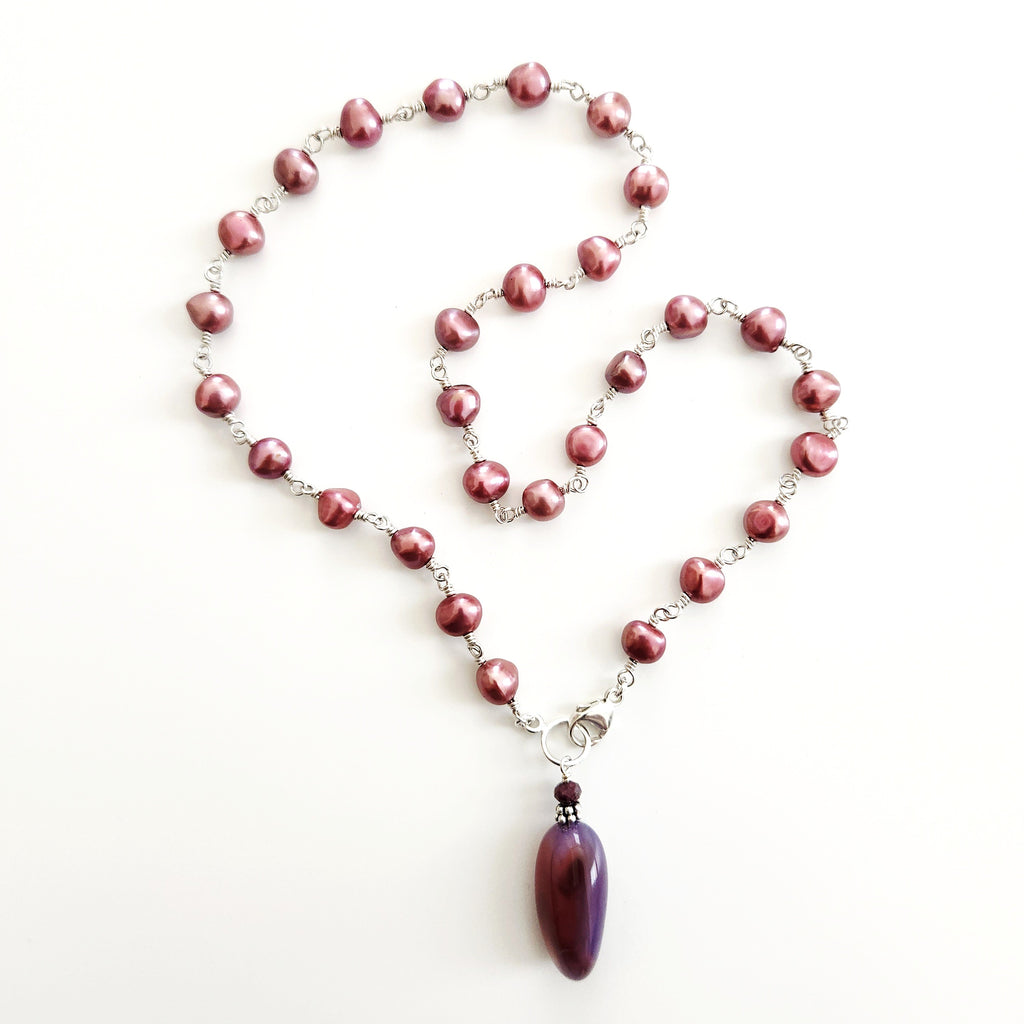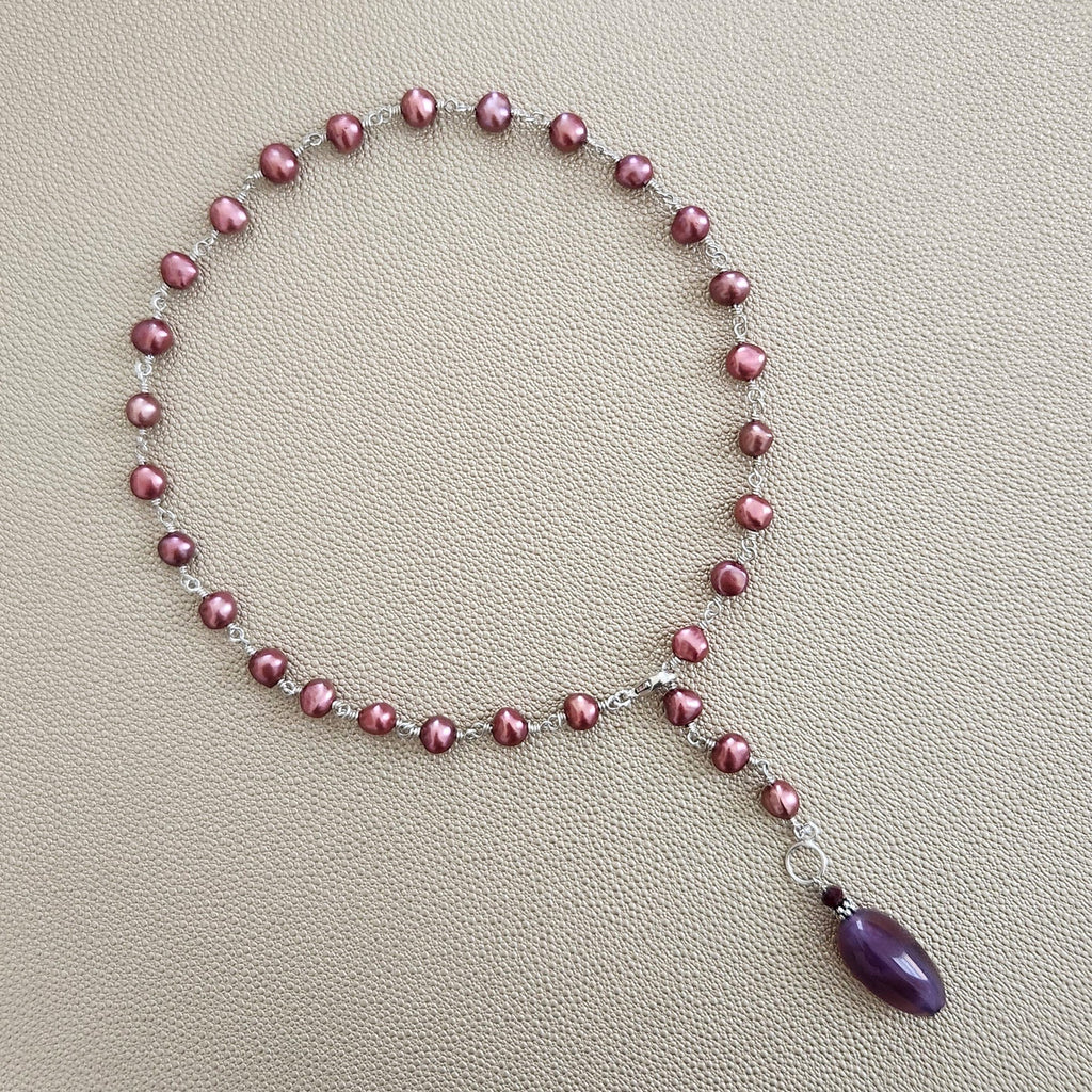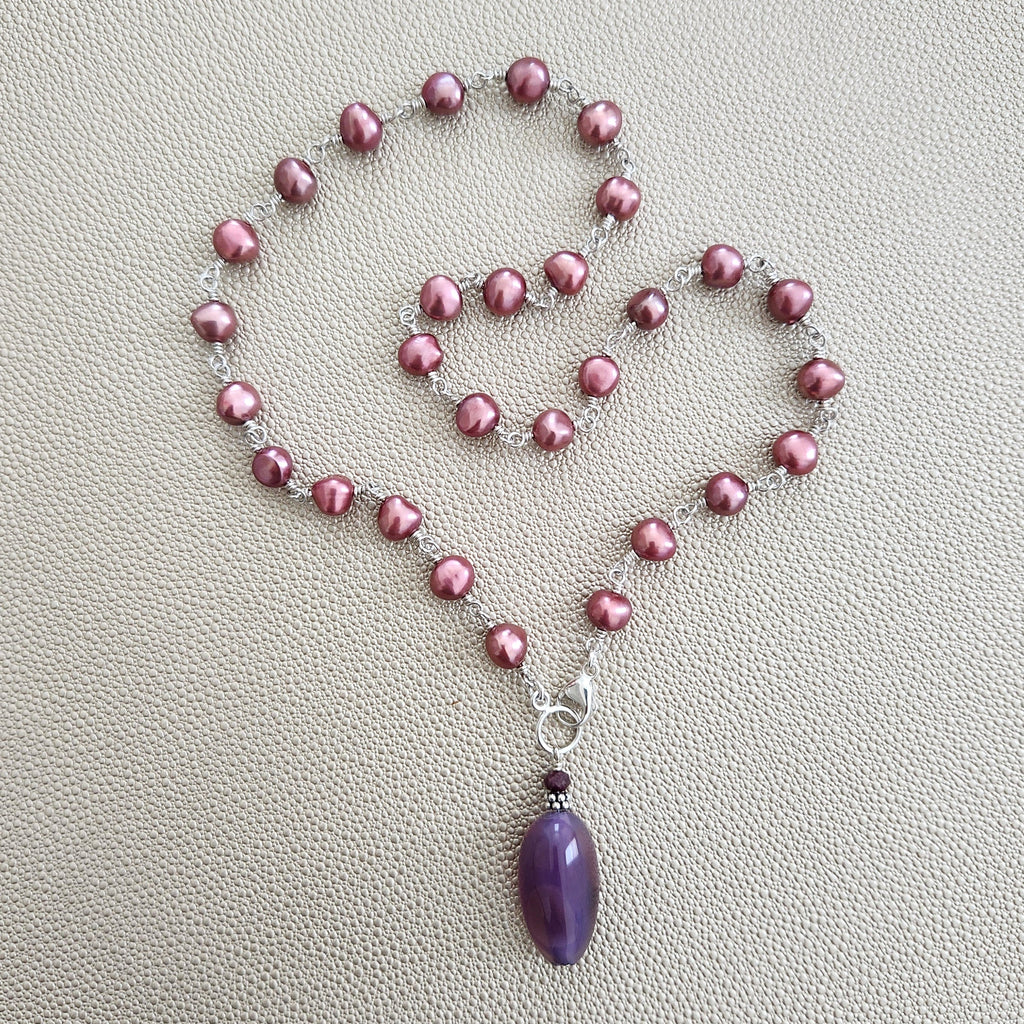 DARK ROSE PEARL NECKLACE WITH PURPLE AGATE DROP-19"