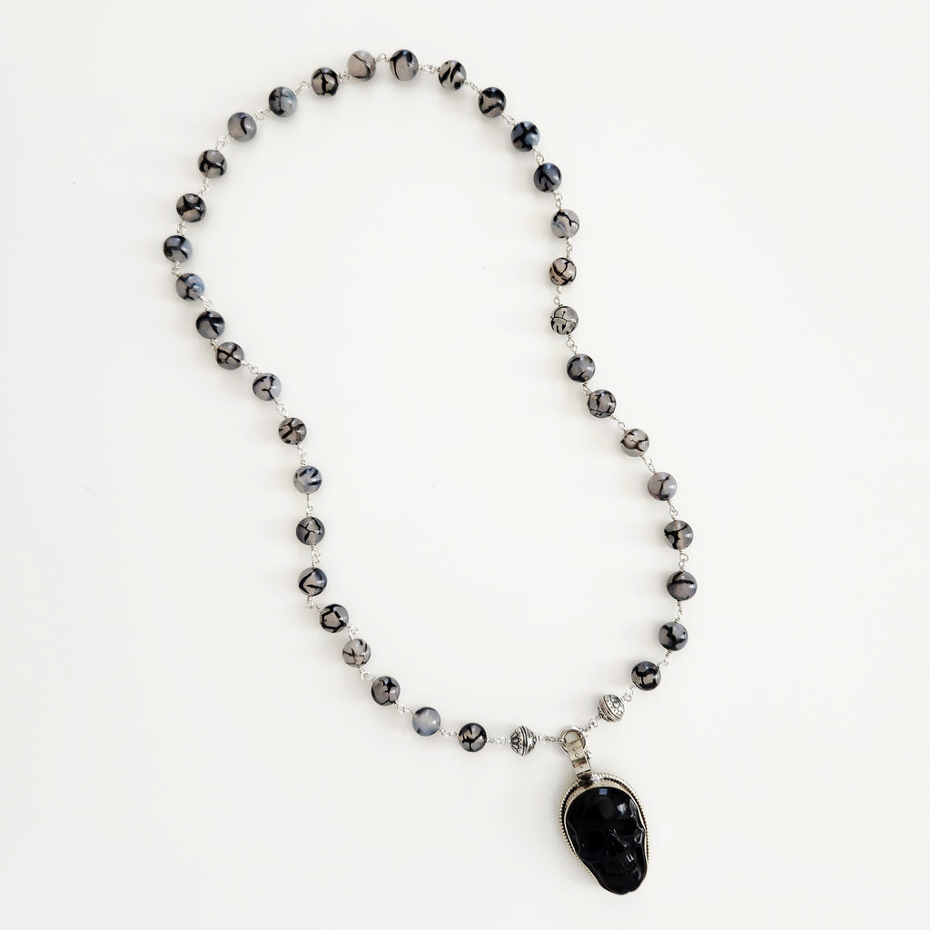 00--BLACK WHITE DRAGON VEIN AGATE NECKLACE W/ SKULL PENDANT-27"