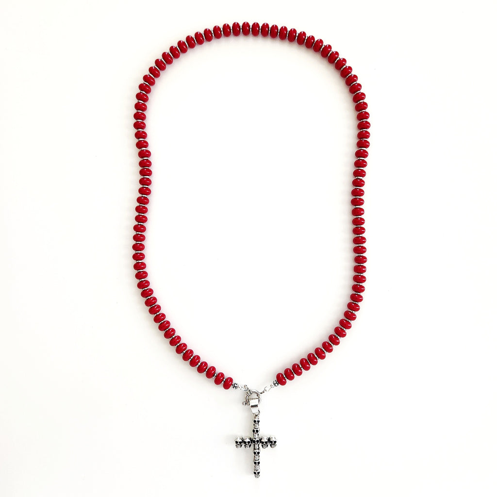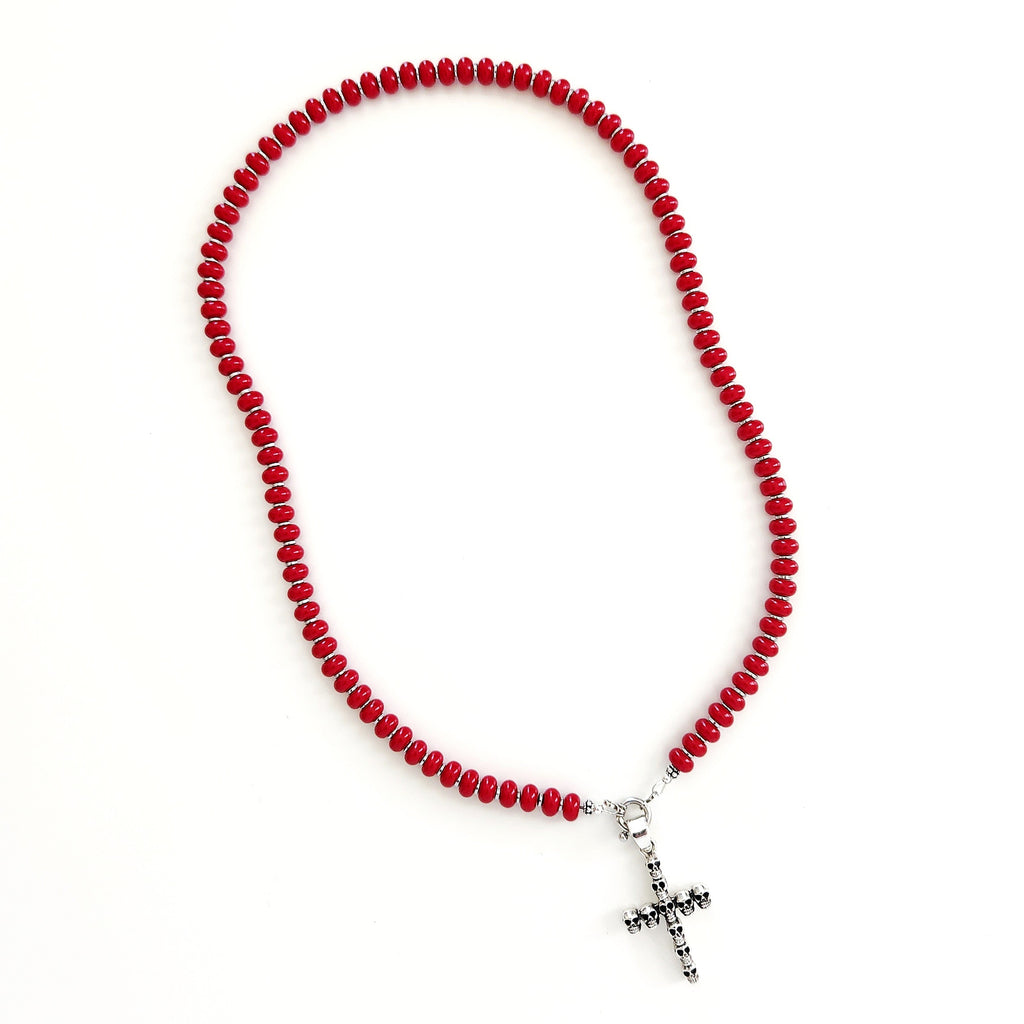 00--RED COLOR JADE NECKLACE W/ SKULL CROSS PENDANT--24"