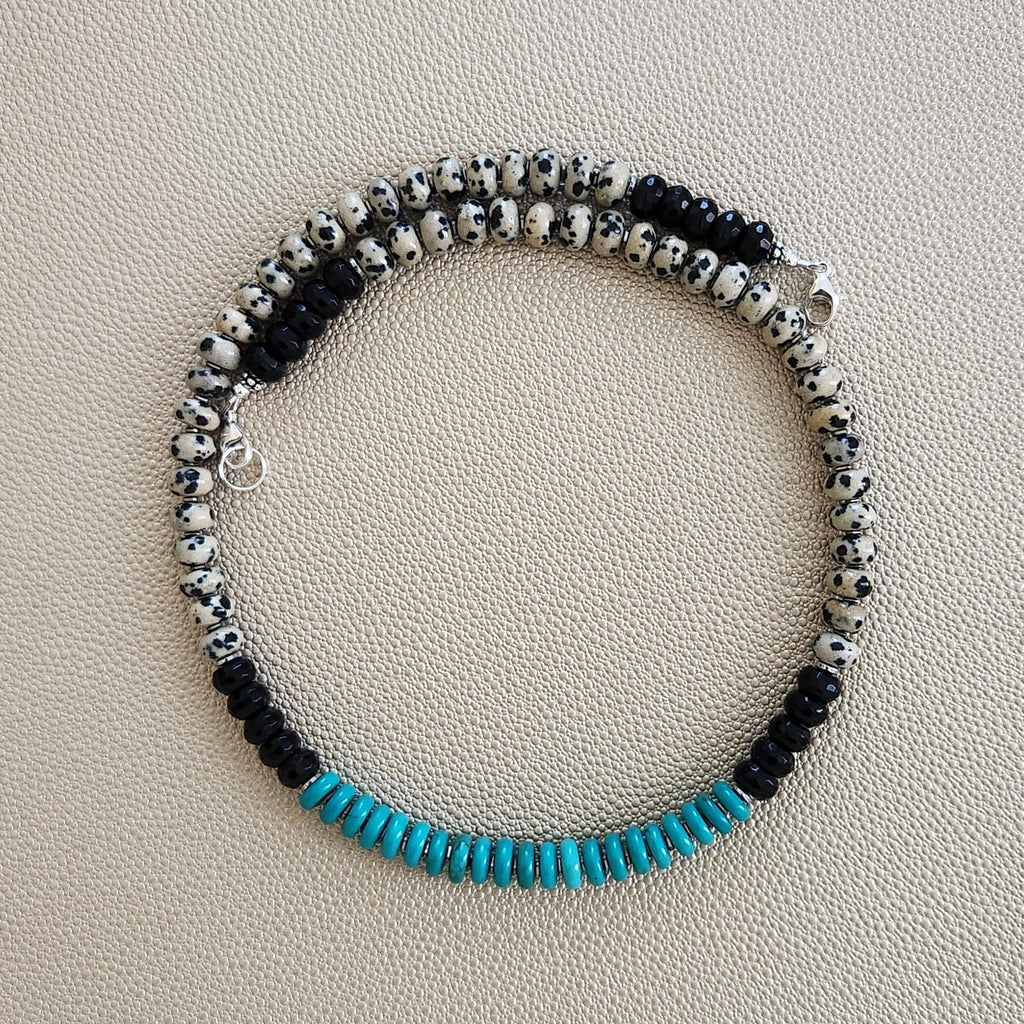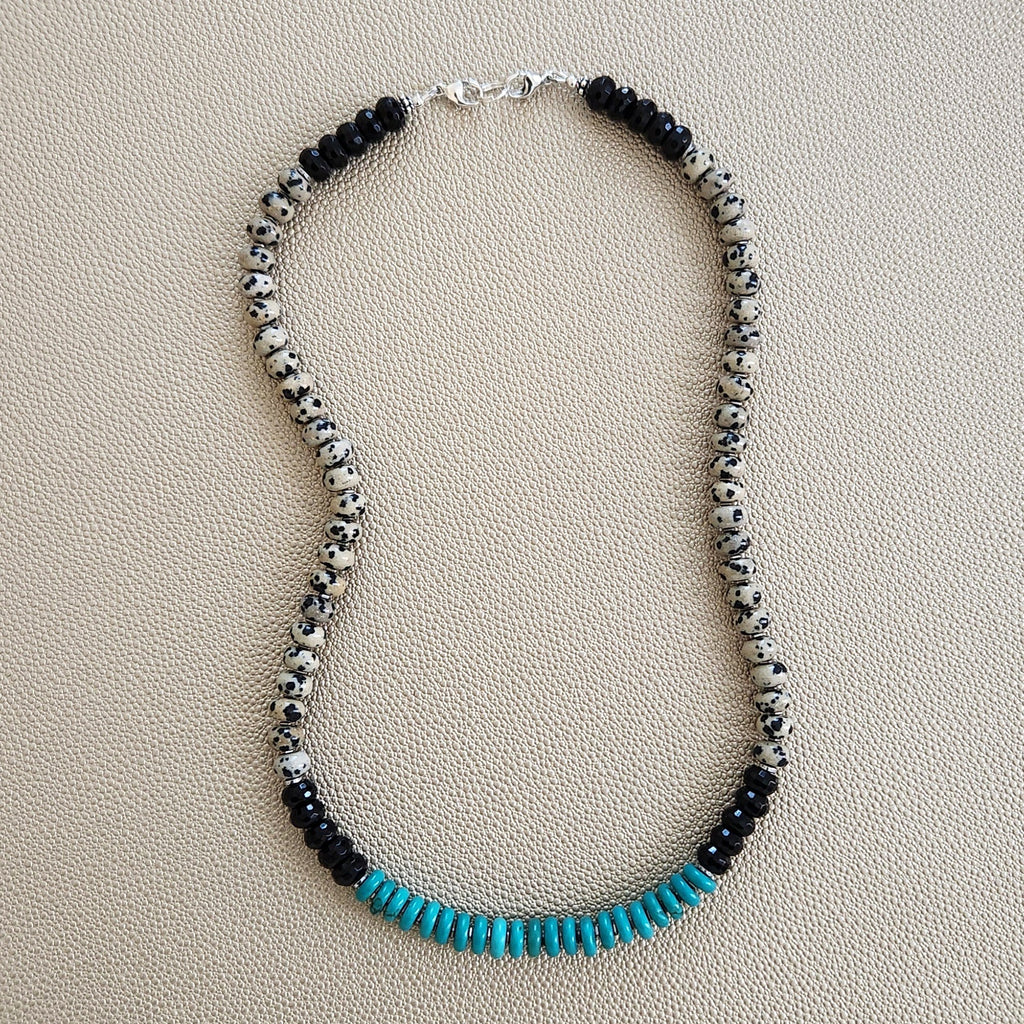 - Necklace made with a mix of turquoise (3x8mm), faceted black onyx (5x8mm) and natural Dalmatian jasper (5x8mm)