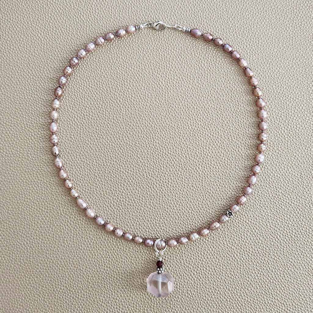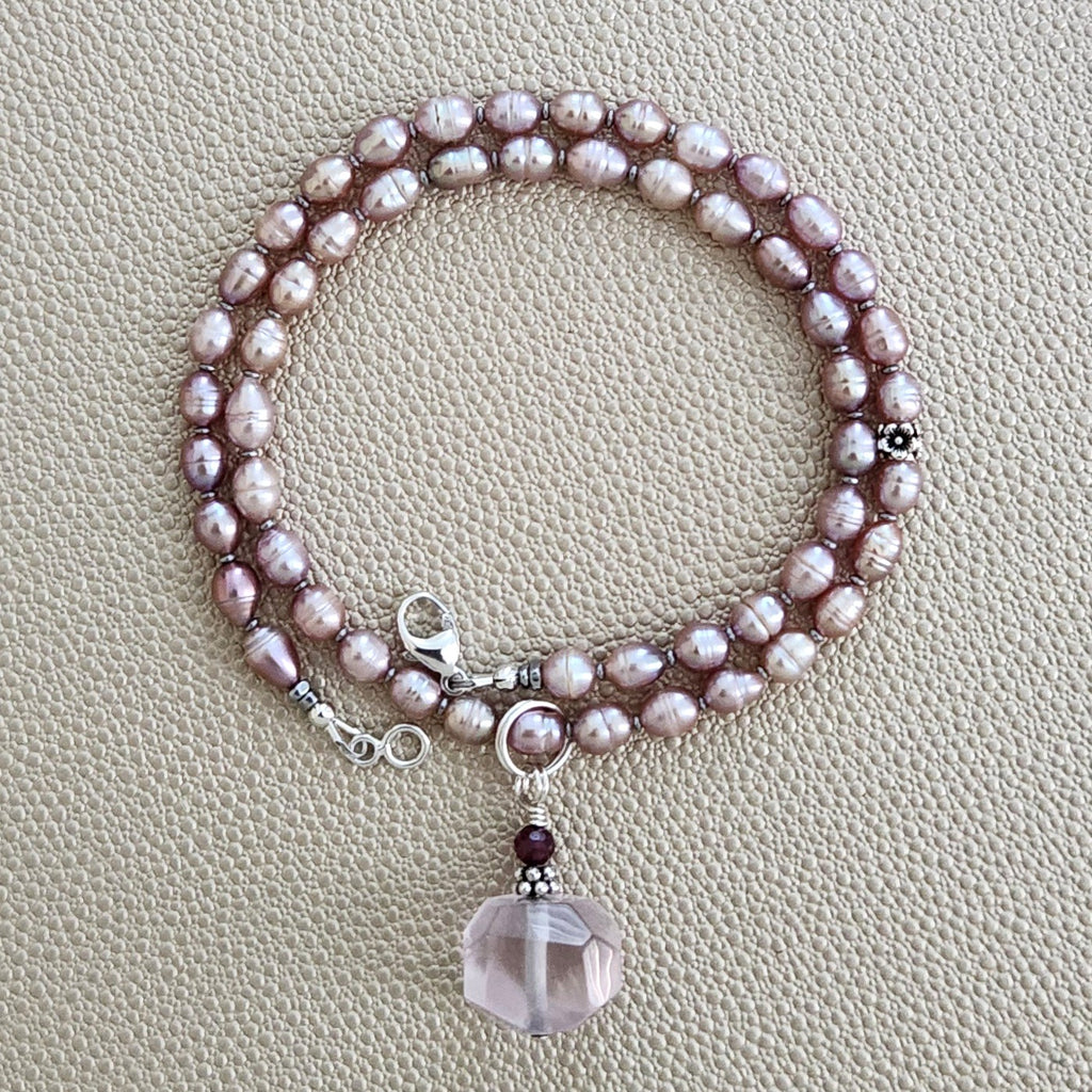 0--NATURAL PURPLE PEARL NECKLACE W/ ROSE QUARTZ DROP--16"