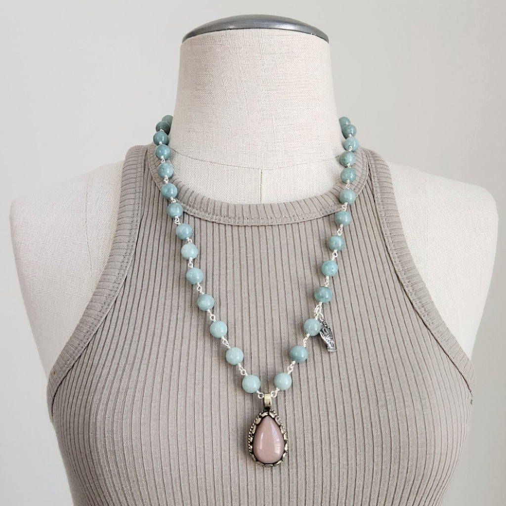 GREEN JADE NECKLACE WITH ROSE QUARTZ PENDANT-24"