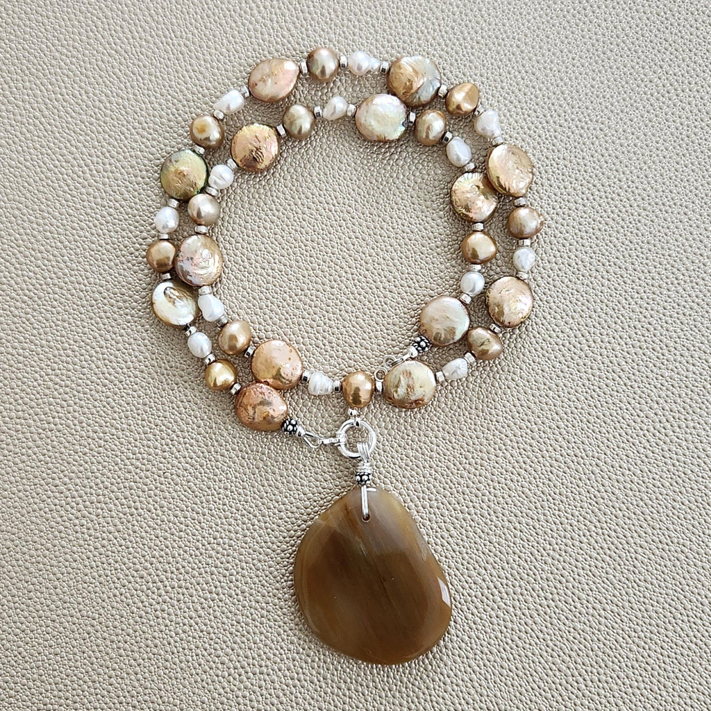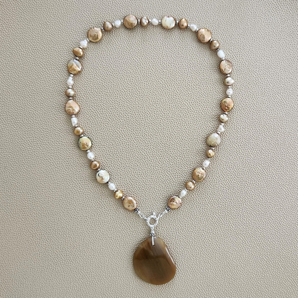 - Necklace with a mix of freshwater pearls--17mm gold pearl coin, 8mm gold pearl nuggets and 5x7mm white pearl nuggets
