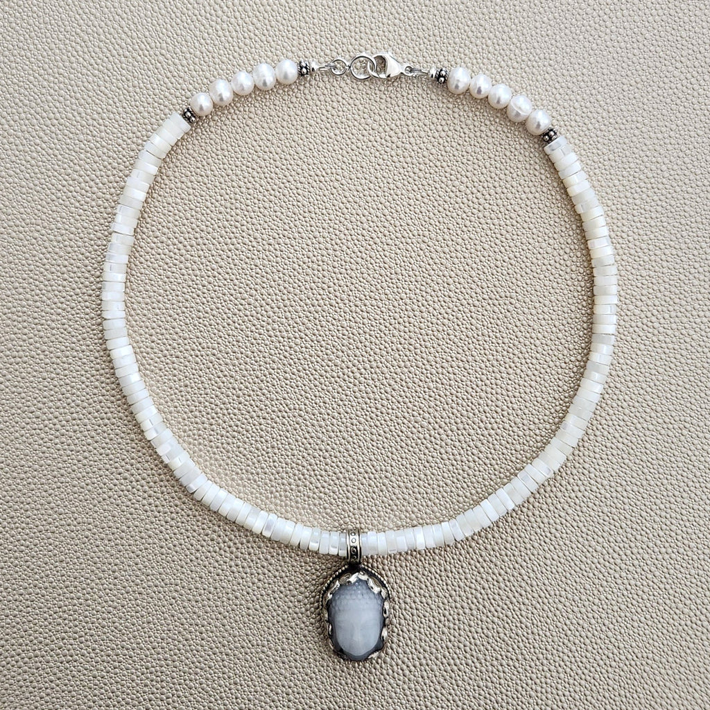 - Mother of pearl heishi necklace (stones 2X6mm)